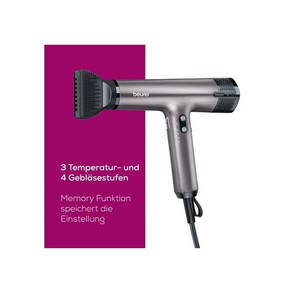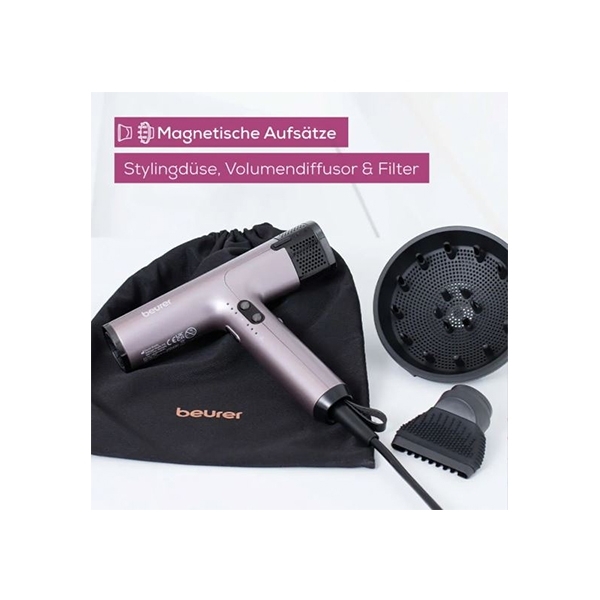 Mit drei Temperatur- und vier Gebläse-Stufen wird das Styling besonders haarschonend. Trotz hoher Leistung bleibt der Trockner mit 70 Dezibel leise. Die Ionenfunktion sorgt für glänzendes Haar, während die Kaltstufe das Styling fixiert. Die Magnetaufsätze für Styling- und Diffusor-Düse lassen sich schnell wechseln und der herausnehmbare Filter ermöglicht einfache Reinigung. Mit Überhitzungsschutz, 2,8 m langem Kabel und Aufhängeöse.