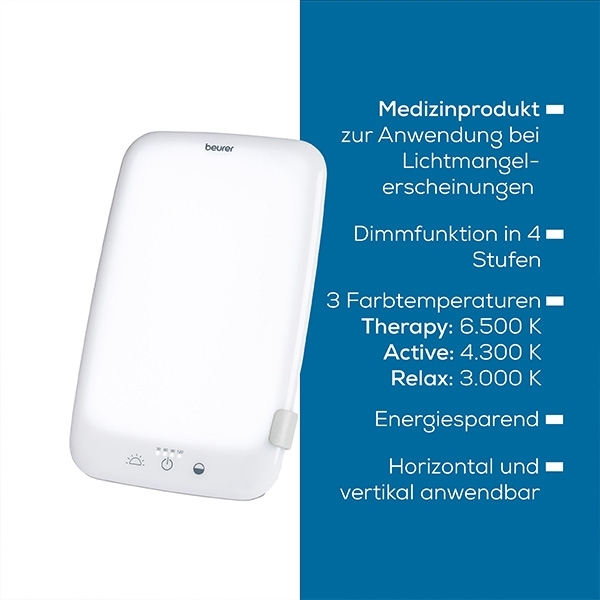 Die Beurer Tageslichtlampe TL 35 bringt Sonnenlicht in dein Zuhause. Mit 10.000 Lux simuliert sie die natürliche Helligkeit und unterstützt einen gesunden Tag-Nacht-Rhythmus. Drei einstellbare Farbtemperaturen sorgen für das perfekte Licht in jeder Situation. Konzentriertes Arbeiten. Entspannte Erholung. Lichttherapie. Dank kompakter LED-Technologie und abnehmbarem Standfuß passt sie in jedes Ambiente. Die komfortable Bedienung per Touch-Button und die stufenlose Neigungsverstellung machen sie zum vielseitigen Begleiter an sonnenarmen Tagen.
