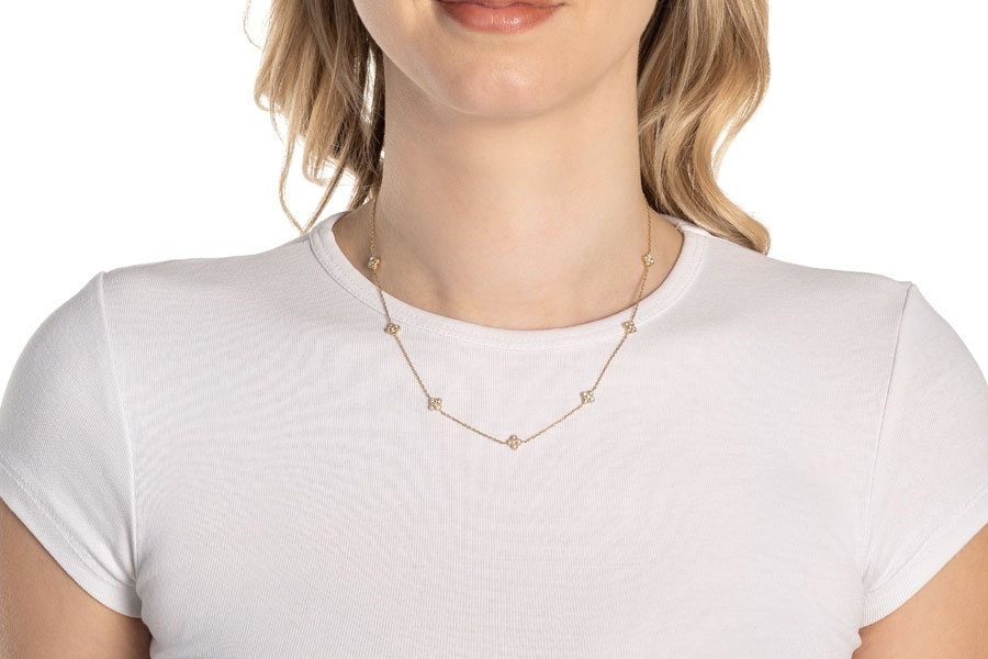 Warm, elegant und romantisch: Die Halskette Lisette begeistert mit filigraner Ankerkette und sieben floralen Elementen, die mit funkelnden Zirkonia-Steinen verziert sind. Die zarte Struktur des Metallrands unterstreicht den blumigen Look und verleiht dem Design eine besondere Tiefe. Mit Karabinerverschluss und Verlängerungskette sitzt die Kette immer perfekt – ideal für deinen persönlichen Stil, ob im Alltag oder zu besonderen Momenten.
