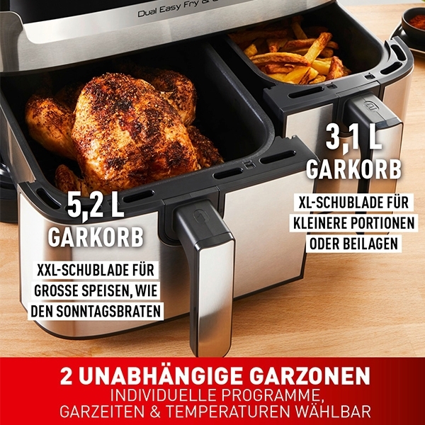 Mit der Dual Easy Fry & Grill Heißluftfritteuse erlebst Du ein völlig neues Kocherlebnis, das Vielfalt und Genuss in Ihre Küche bringt. Die innovative Fritteuse bietet die Möglichkeit, zwei unterschiedliche Speisen gleichzeitig zuzubereiten - und zudem in Rekordzeit.